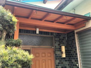 外壁の焼杉板が劣化しているので、ガルバリウム鋼板への改修をお勧めしました。玄関庇、箱庇も同様に改修しました。